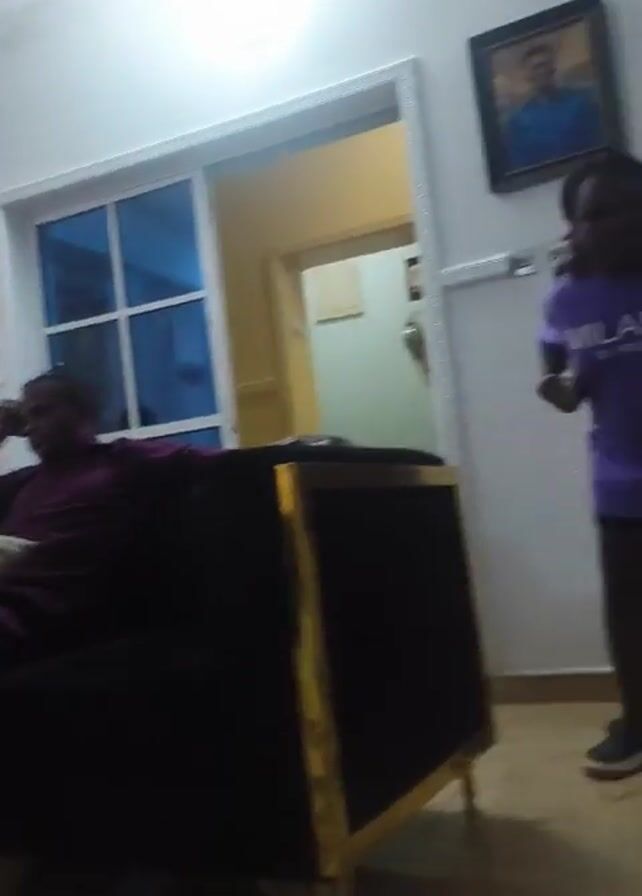The video begins inside a house. Two men are sitting on a couch in the living room, and a water bottle is on the floor nearby. Then, the camera pans to a girl carrying a baby on her back. She is wearing a purple shirt that says “Milano de Rouge”, black shorts, and dark blue shoes. She walks around the room, and there is shelving and a mirror in the background.