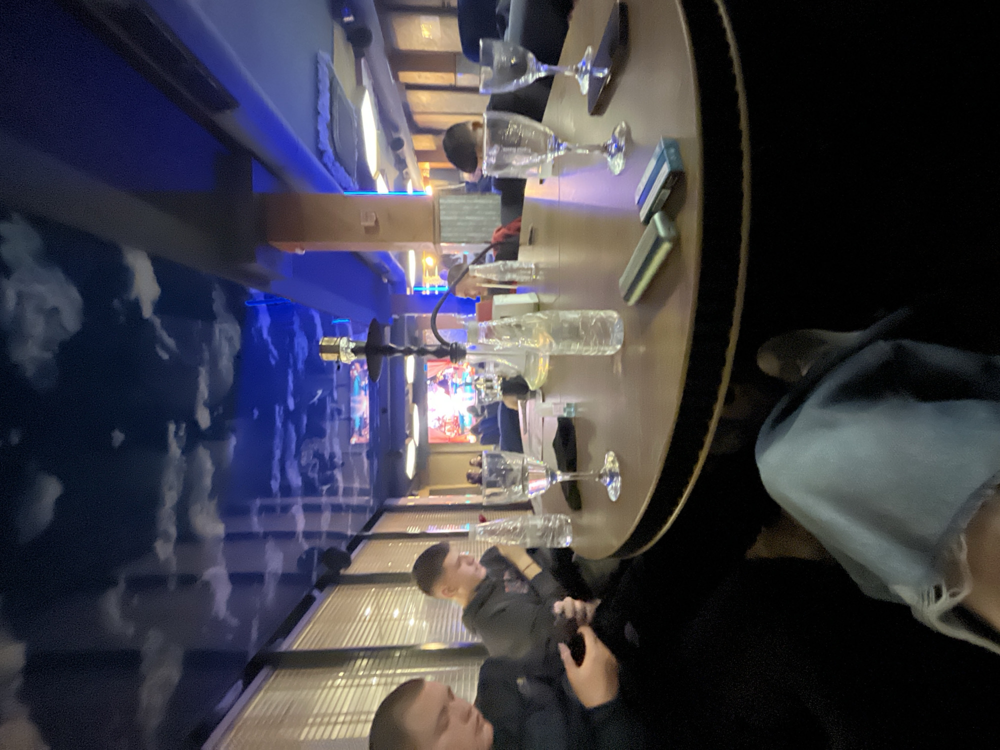 The image depicts an indoor scene, likely a lounge or hookah bar, during evening hours