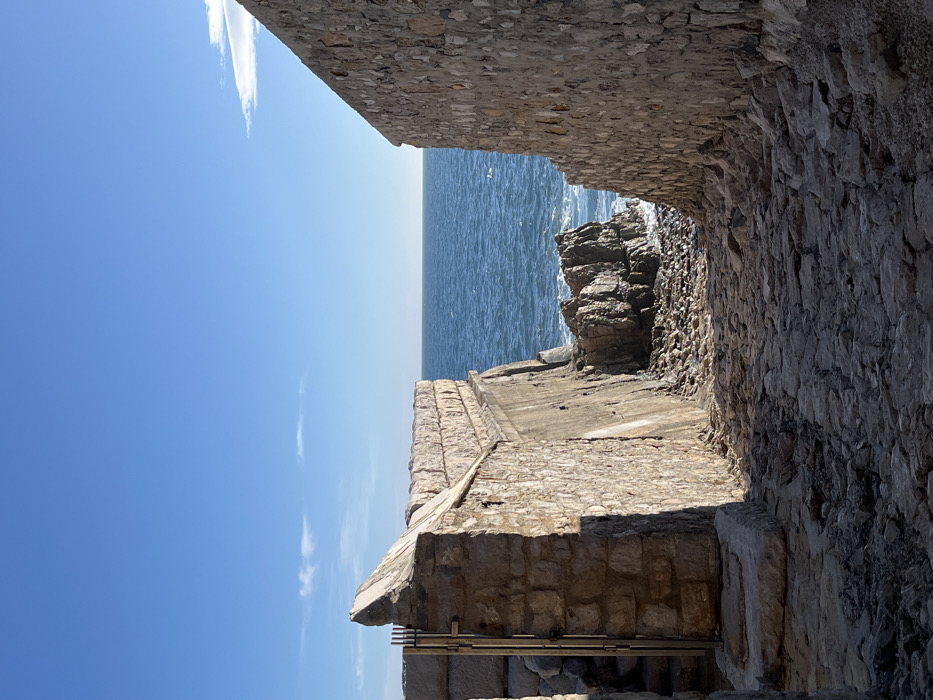 - "Captured from a high vantage point, a sliver of tranquil blue sea meets a clear sky, framed by weathered stone structures" by FM-vTiXm2, licensed under CC BY 4.0