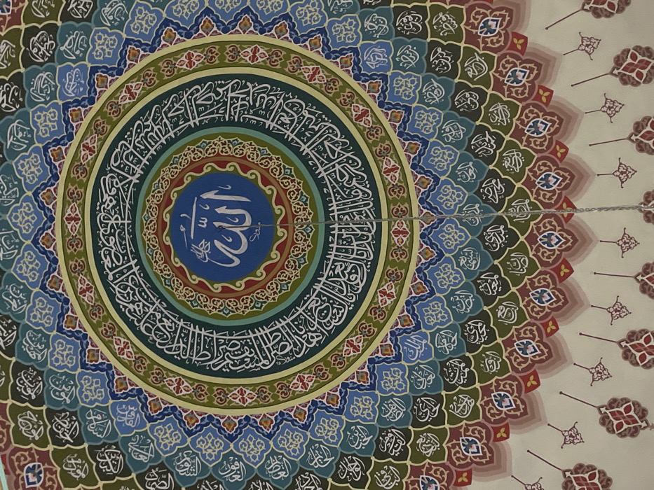 Centered is a circular, ornate design with concentric rings. The innermost circle has white Arabic calligraphy on a blue background, bordered by red and green. The next ring displays white calligraphy on a green background. The following band features detailed geometric patterns. This continues outward in a radiating fashion, using blues, greens, reds, and browns, adorned with white calligraphy. Chains bisect the image from top to bottom. The background is a pale beige with decorative elements.