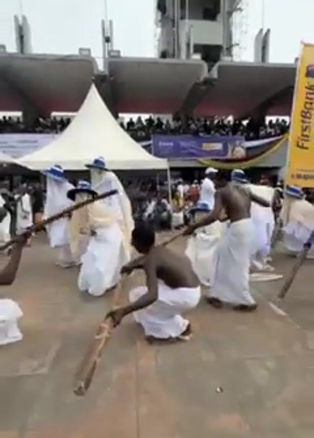 group of people engaged in a ritualistic dance in an outdoor setting. Several individuals are dressed in white robes with blue and white hats, while two men are shirtless and wear white trousers. They are holding wooden staffs, which they strike against the ground or each other during the dance. The dance takes place on a paved area marked with circular patterns. Behind them is a crowd of spectators seated in stadium-style seating under a white tent. Banners with "FirstBank" are visible, suggesting a sponsored event. The environment includes a tall stadium light tower in the background, and the overall atmosphere suggests a cultural or ceremonial event taking place in a stadium or arena.