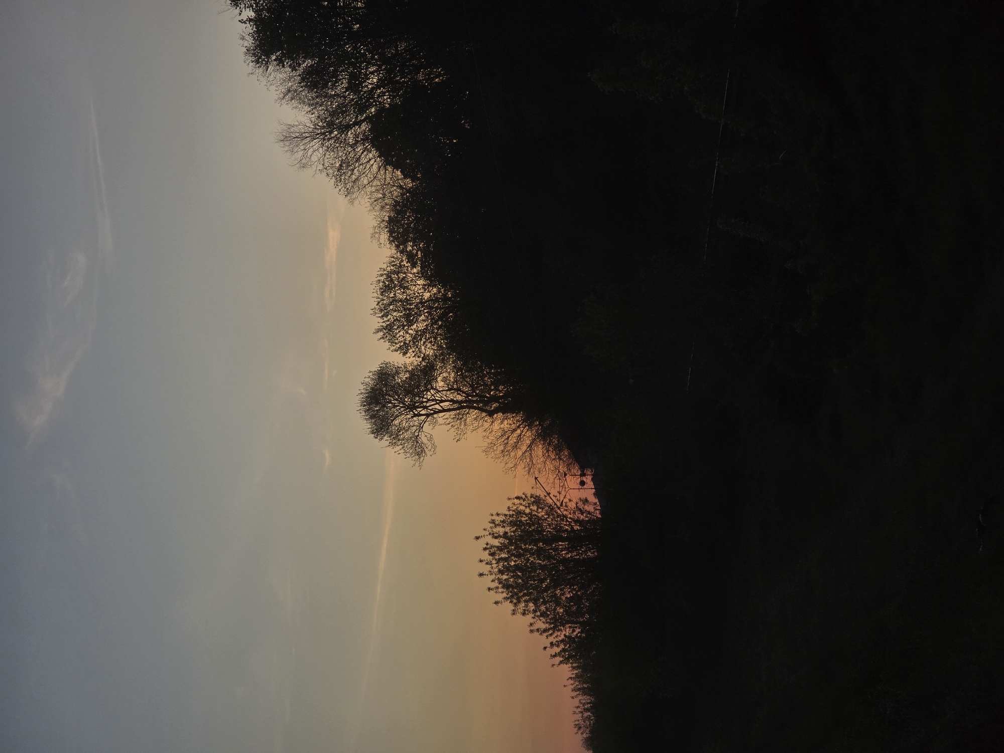 The image depicts a landscape at dusk, likely located on the outskirts of Ruse, Bulgaria. A gradient sky transitions from a pale blue-gray to an orange-yellow near the horizon. Dark, silhouetted trees and vegetation line the right side of the frame, forming a dense border. Bare branches of some trees are visible against the sky. A few electrical poles are seen in the center of the image. No people or animals are visible.