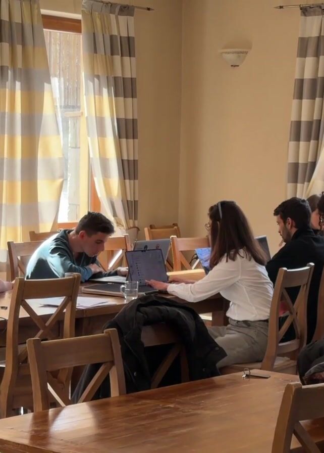 Several people are gathered in a bright room, seated at wooden tables. Three windows adorned with striped curtains allow sunlight to illuminate the space. Most of the individuals are focused on laptops or papers spread out before them, seemingly engaged in work or study. Coats are draped over the backs of the chairs. The room has a warm, casual atmosphere, suggesting it could be a common area in a lodge or retreat.
