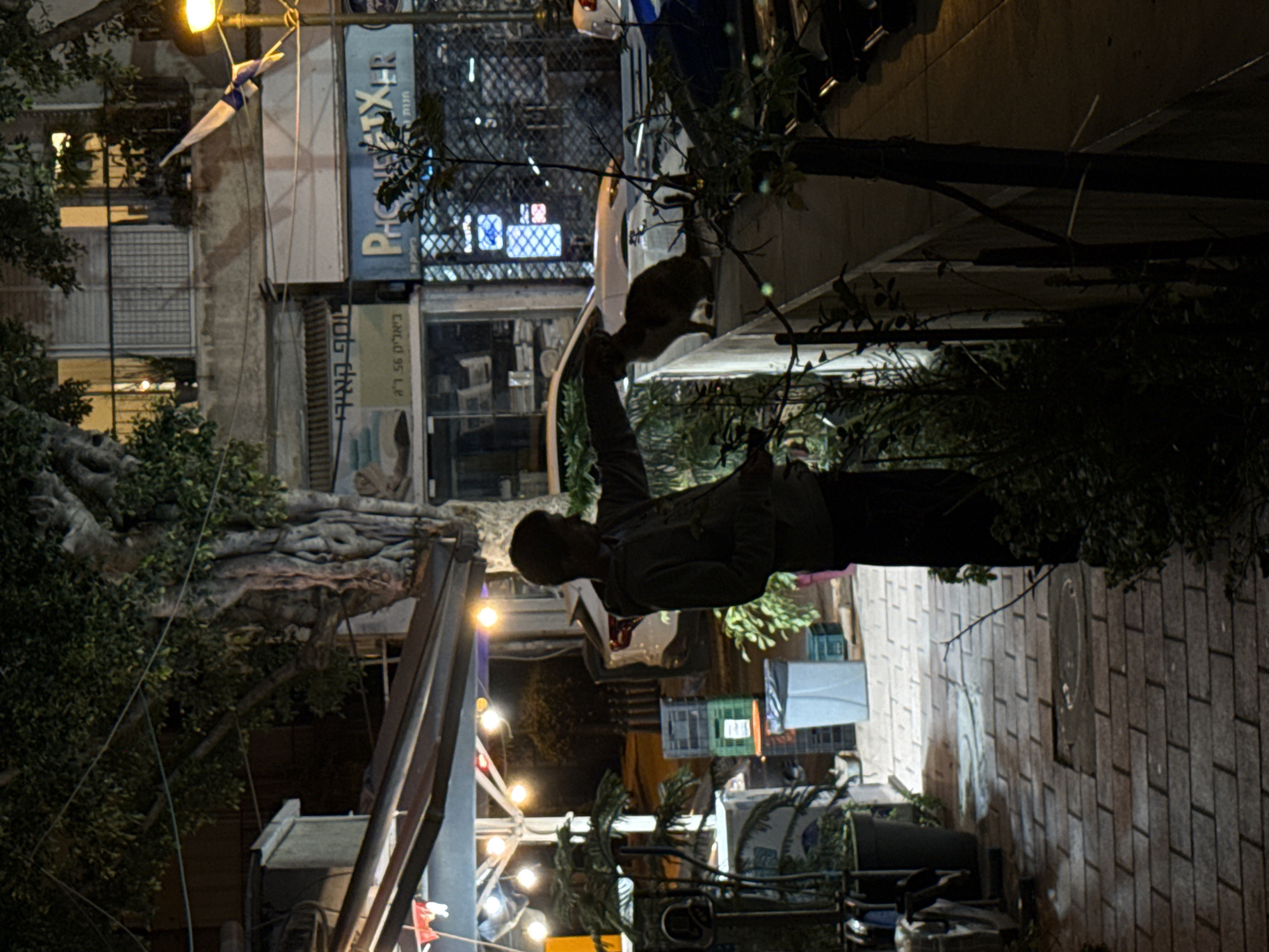 A dimly lit street scene in Ramat Gan, Israel, at night. A person stands on the sidewalk, appearing to reach up towards something in a tree. There is a cat on top of the person's hand. Buildings with signs, including one that reads "Phonexer" in Hebrew, line the street in the background. A tree hangs overhead, and streetlights illuminate the area. The sidewalk is paved with textured bricks.