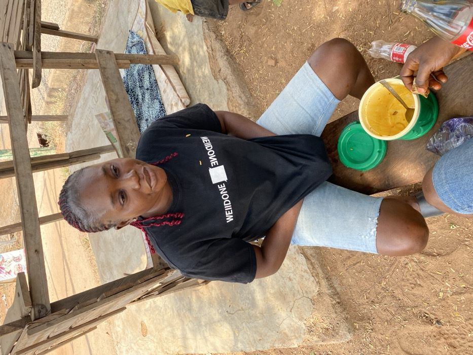 The image depicts a woman seated on a wooden bench outdoors in Adankolo, Nigeria