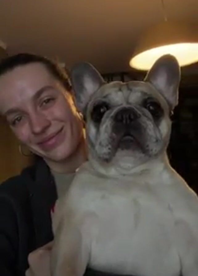 A woman is holding a French Bulldog in her arms and smiling at the camera