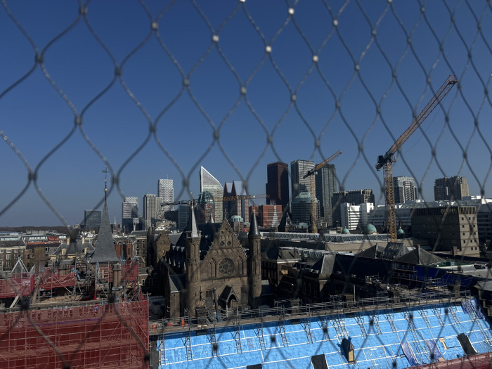 The image displays an elevated view of the city center of The Hague, Netherlands, under a clear blue sky. A grey metal mesh safety net with a diamond pattern occupies the entire foreground, slightly out of focus. Below the mesh, the urban landscape is visible. In the midground, a historical area is characterized by a large, dark stone gothic-style church, identified as the Grote Kerk (St. James' Church), featuring a prominent circular rose window. To the left of the church, a building is extensively covered in red scaffolding, with a dark, conical spire topped with a cross rising above it. To the lower right, a large roof area is covered with blue tarpaulins, indicating another construction or renovation project, with grid-like support structures visible on its surface. The background reveals a modern city skyline. Numerous high-rise buildings, constructed from glass and concrete, present various contemporary architectural styles. A distinct white, angular, wedge-shaped skyscraper is visible among them. At least three large yellow tower cranes are positioned within this modern skyline, signifying active construction. The scene is illuminated by direct sunlight, casting no visible shadows within the frame due to the high vantage point. No individuals are discernibly visible.