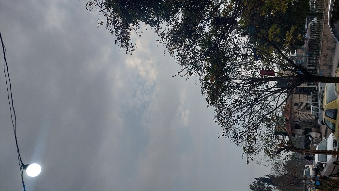 A daytime street scene with an overcast sky. A light fixture hangs from a wire on the left. Bare tree branches frame the top, with a red cloth visible in one. Buildings and parked cars are on the right side. The scene appears muted and gray.