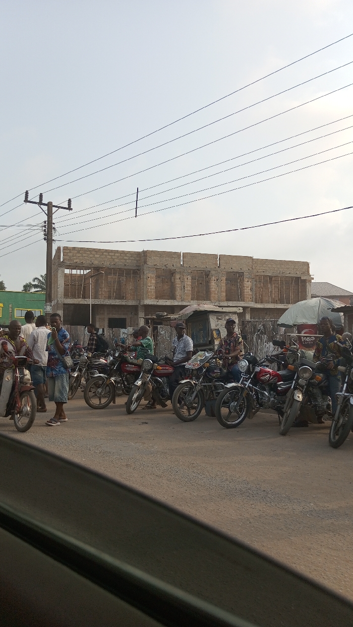 The image depicts a street scene in Ihiala, Nigeria, under an overcast or hazy sky. The perspective is from a vehicle, with a dark window frame visible in the lower left foreground. A paved road surface occupies the lower half of the frame. In the midground, approximately fifteen adult males are present, predominantly gathered around a line of motorcycles parked or idling along the roadside. Many men are seated on their motorcycles, facing generally towards the viewer or to the right. One man in a patterned shirt and blue shorts stands holding a phone to his ear, facing left, near a red motorcycle. Another man in a white long-sleeved shirt and dark trousers stands with his back to the viewer near a group of men. The motorcycles are various models, mostly standard commuter bikes, with a prominent red one centrally located. The background features several buildings. A partially constructed two-story building made of concrete blocks dominates the center-right, showing exposed blockwork, wooden supports within window openings, and an uncompleted roofline. To the left of this structure, a green building with a partial yellow sign is visible. To the right of the construction, a cluster of smaller, less defined structures, possibly stalls, are present, including one with a white umbrella displaying red text, possibly "RED Lorra". A wooden utility pole with insulators and multiple power lines extends from the left side of the frame, with more power lines traversing the upper portion of the sky. The scene is illuminated by natural daylight.