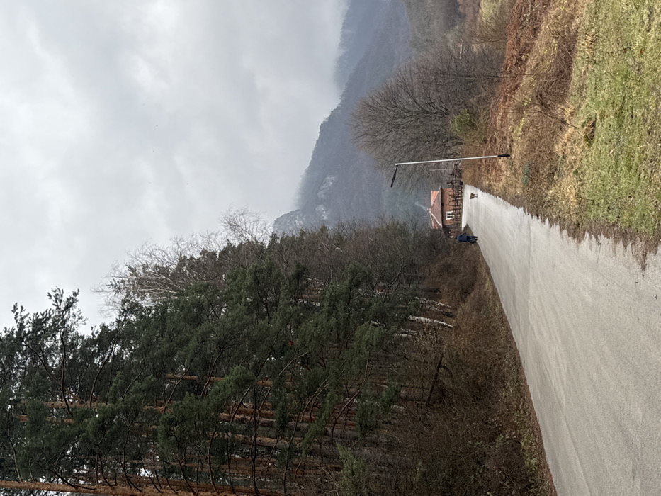 This image depicts a rural asphalt road in Zgorigrad, Bulgaria, under an overcast sky. The road, appearing damp, curves slightly right and ascends into the distance. To the left, a dense line of tall coniferous trees with dark green needles and several bare deciduous trees borders the road, accompanied by sparse brown undergrowth. On the right, the roadside features a grassy slope transitioning to dry, brown vegetation. A tall, slender streetlamp with a rectangular LED light fixture is positioned on the right side of the road. Further along the road, a single individual wearing dark clothing walks away from the viewer, accompanied by a small, dark-colored dog walking ahead, both proceeding towards a single-story house. This house, located on the right side of the road, features a red-tiled roof, light-colored walls, and a visible chimney from which smoke or steam is emanating. A wooden fence runs along the road in front of the house. Distant mountains, partially obscured by mist or low clouds, form the background. The overall scene suggests a cool, damp environment, likely late autumn or winter.