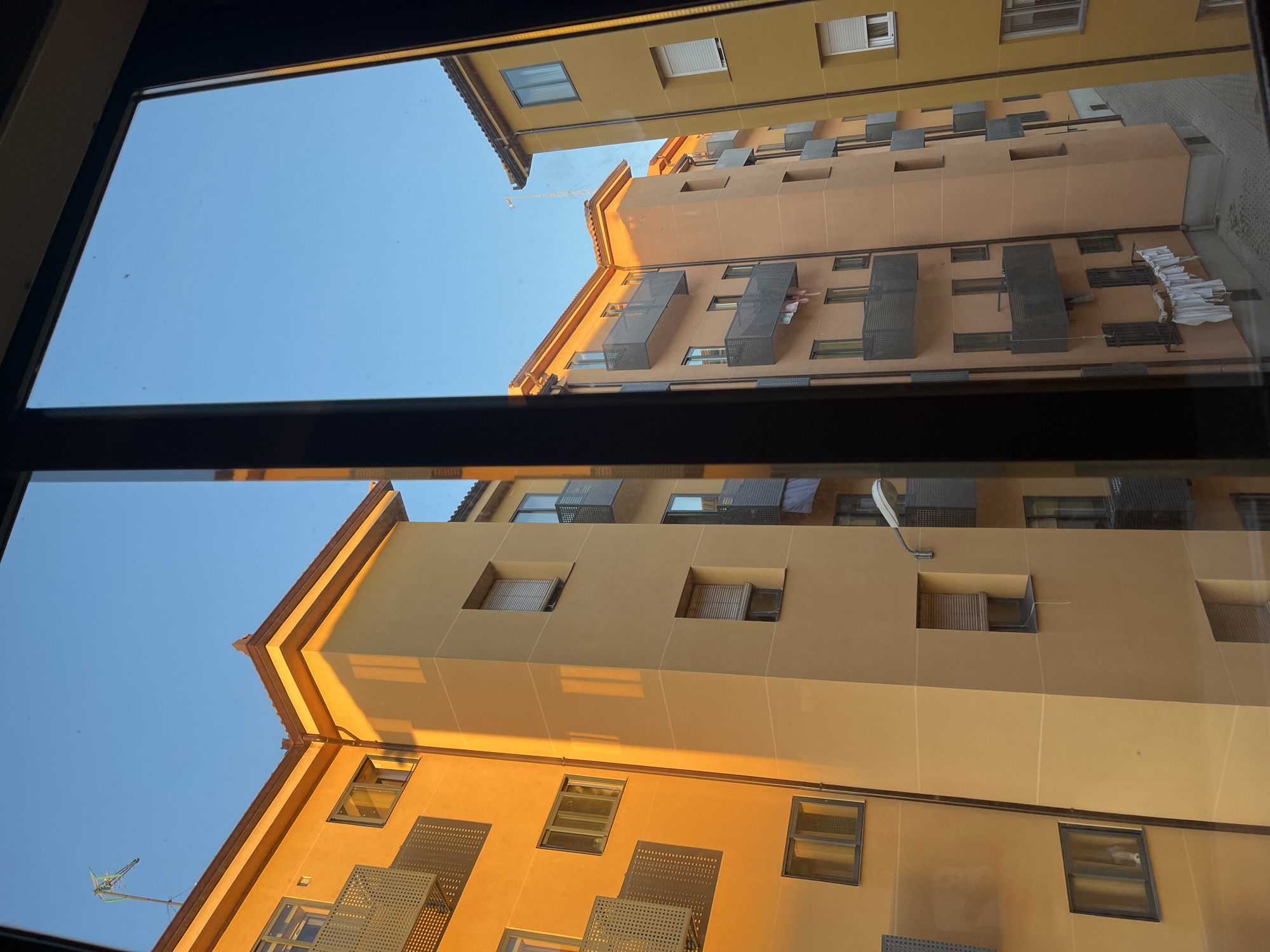 The image displays an exterior view of a residential complex in Segovia, Spain, seen through a dark-framed window. Multiple multi-story apartment buildings are illuminated by warm, low-angle sunlight, indicative of either early morning or late afternoon, under a clear, unblemished blue sky. The prominent building on the left, an approximately six-story structure, features a light ochre-yellow facade. It contains numerous dark-framed windows and several balconies with dark gray, perforated metal railings, which cast distinct grid-like shadows onto the building's surface. A green and metallic television antenna is visible on its rooftop. A small, indistinct white figure, potentially an animal, is partially visible inside a lower-level window of this building. To the center and right, an adjacent multi-story building with a light peach-colored facade is present. This building also features dark-framed windows, some of which are covered by light-colored external rolling blinds (persianas). Several balconies with perforated metal railings are visible, with white and light-colored laundry hanging to dry from a lower balcony railing. A white streetlamp with a curved arm extends horizontally from one of its facades. A third, partially visible building matching the ochre tone appears on the far right. At ground level, a paved courtyard or narrow alleyway, composed of light-colored block paving, is visible between the buildings. The foreground of the image is defined by the dark vertical and horizontal window sashes, with minor dust specks visible on the glass pane. No people are explicitly visible.