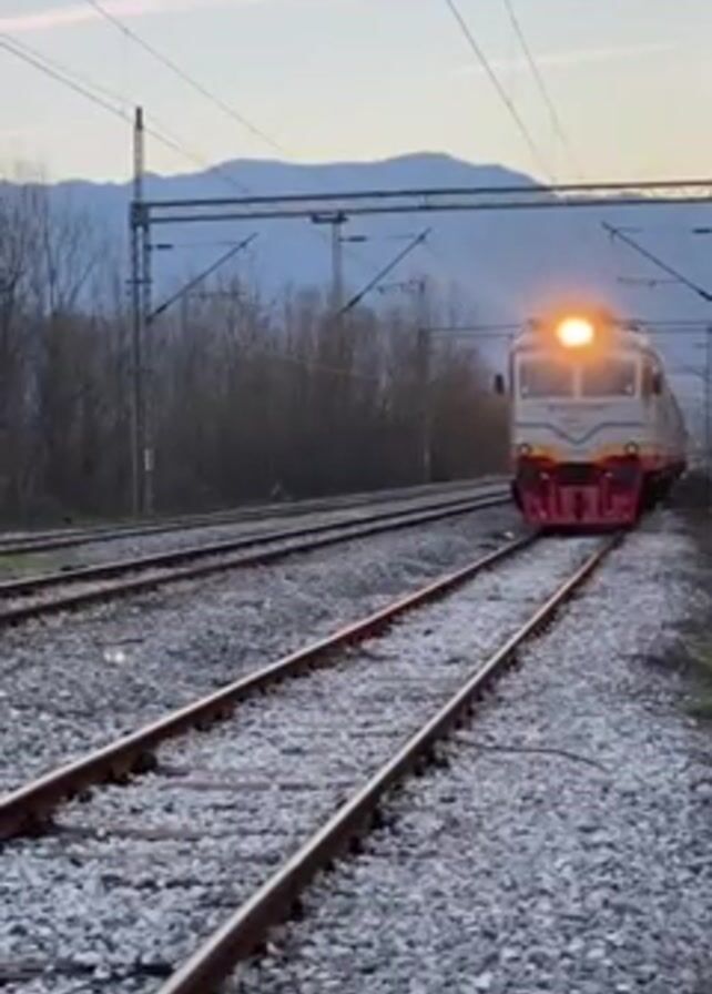 train approaching on a track surrounded by gravel. The train is painted with a red and yellow stripe below the windows on the front. The train has a light on the front that is illuminated, and the track is surrounded by gravel. The background is made up of a mountain range and trees, while the sky is a clear evening sky.