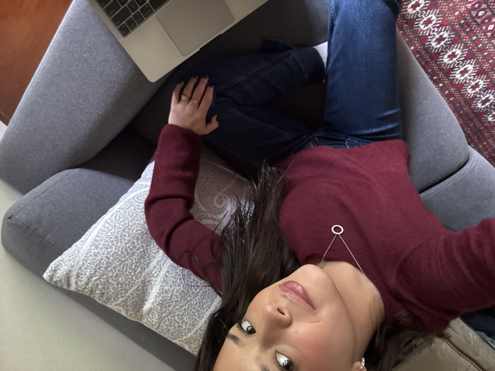 A young woman is seated in a grey upholstered armchair indoors in Huasca de Ocampo, Mexico