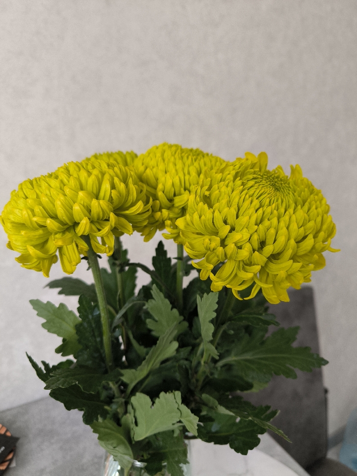 - "A close-up photograph captured in Vinnytsia, Ukraine, depicts a bouquet of three vibrant yellow chrysanthemum flowers" by FM-dWhzM2, licensed under CC BY 4.0