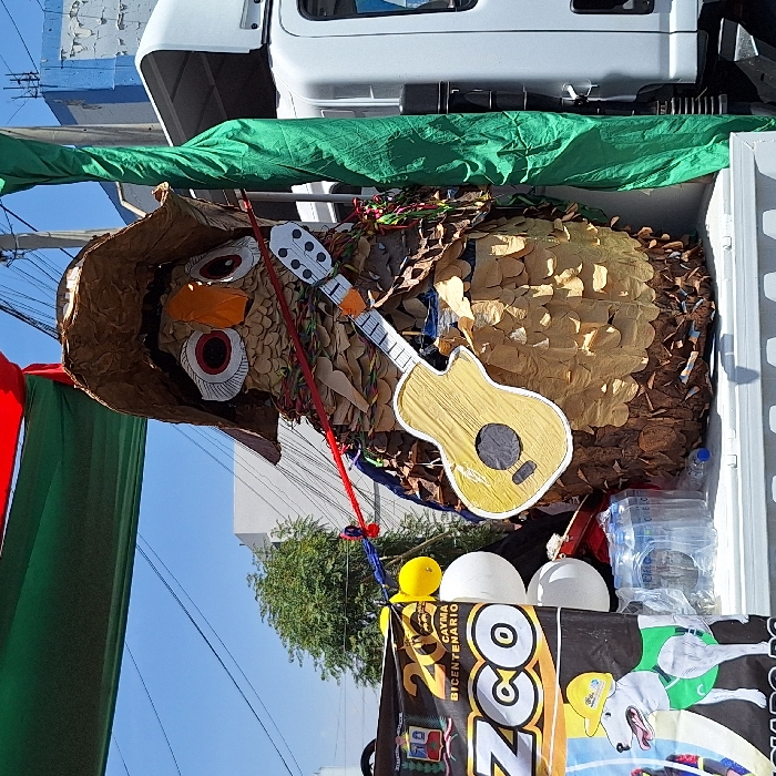 A float or display is decorated with a large, crafted owl with a brown hat and guitar. The owl is made of paper or cardboard. It sits inside the back of a vehicle. A banner with "CAYMA BICENTENARIO" is visible, along with white and yellow balloons. Green cloth is draped, and a clear plastic container rests nearby. The overall scene is colorful and festive.