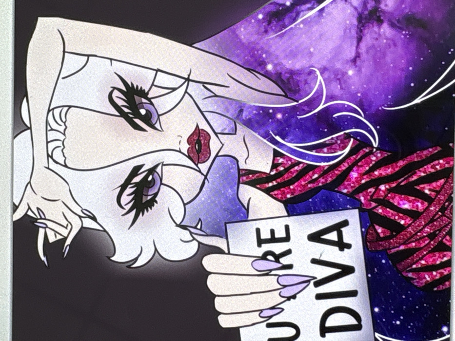 The image displays a stylized cartoon illustration of a female character. The character has pale skin, large purple eyes with prominent black winged eyeliner and long lashes, thin dark eyebrows, and full, glittery red lips. Her hair is voluminous, appearing white or light silver with subtle purple undertones and highlights. She is depicted wearing a garment that transitions from a glittery pink with black zebra-like stripes on the torso to a dark blue and purple cosmic print with stars and nebulae on the shoulders and upper arms. Her right hand, featuring long, pointed purple fingernails, is raised above her head with fingers spread. Her left hand, also with long purple nails, holds a white rectangular sign. The visible black uppercase text on the sign reads "U RE" on the top line and "DIVA" on the bottom line. The background is a solid dark color. This is an illustration and does not depict a physical location in Ruse, Bulgaria.