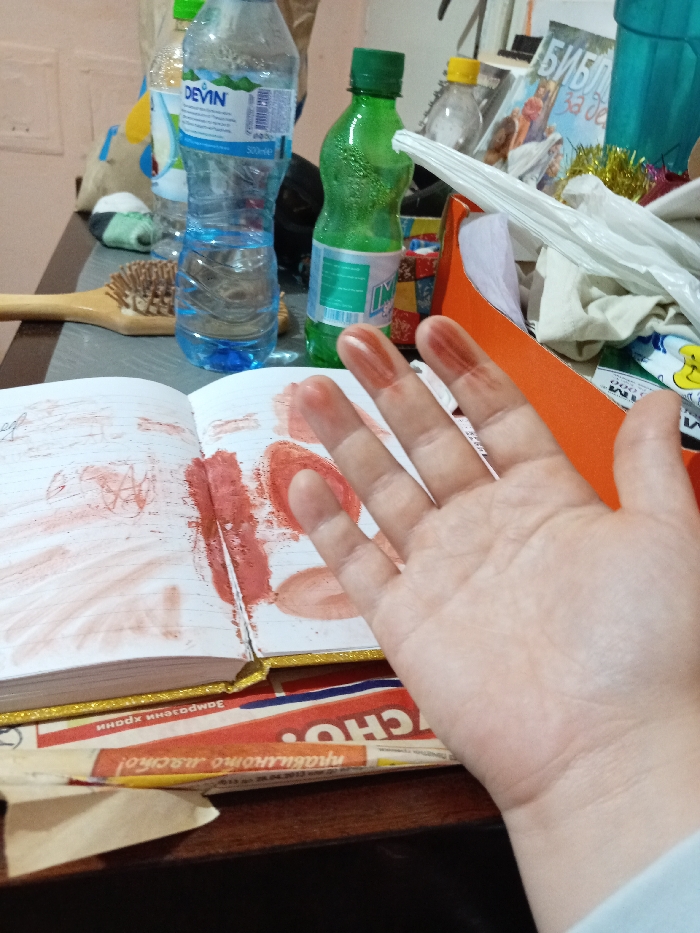 This image depicts a close-up, elevated view of a cluttered tabletop in Войводино, Bulgaria. In the immediate foreground, a human left hand is presented palm-up, with the thumb, index, middle, and ring fingertips coated in a reddish-brown, pasty substance. An open, lined notebook with a gold-colored spine rests on the table, its pages extensively smeared and marked with the identical reddish-brown substance, indicating recent application or testing. To the left of the notebook, a wooden hairbrush with natural bristles is partially visible. The background features a light-colored wall behind an assortment of objects on the table surface: a partially filled clear plastic 500ml "DEVIN" water bottle, a green plastic bottle with condensation, a clear plastic bottle with a yellow cap, a rolled white plastic bag, gold tinsel, a light-colored textile item, a book with Cyrillic text (possibly "Библия за деца"), and a colorful patterned container. A paper wrapper with Cyrillic text, including "СНО" and "прabилно масло!", is visible beneath the notebook. The scene is consistent with an indoor, personal environment.