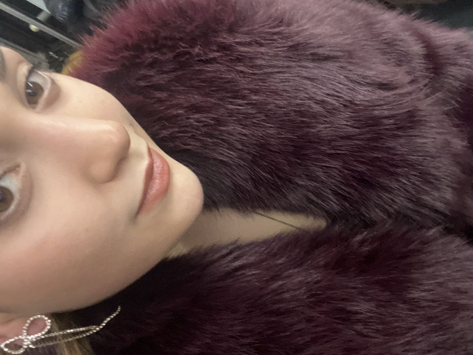 A person with fair skin and light brown eyes looks sideways towards the camera. They wear a burgundy, fur-like garment. Their lips are painted a glossy nude color. An earring shaped like a bow with sparkling accents is visible. The garment surrounds the person’s head and neck. The background is indistinct, suggesting an indoor setting.
