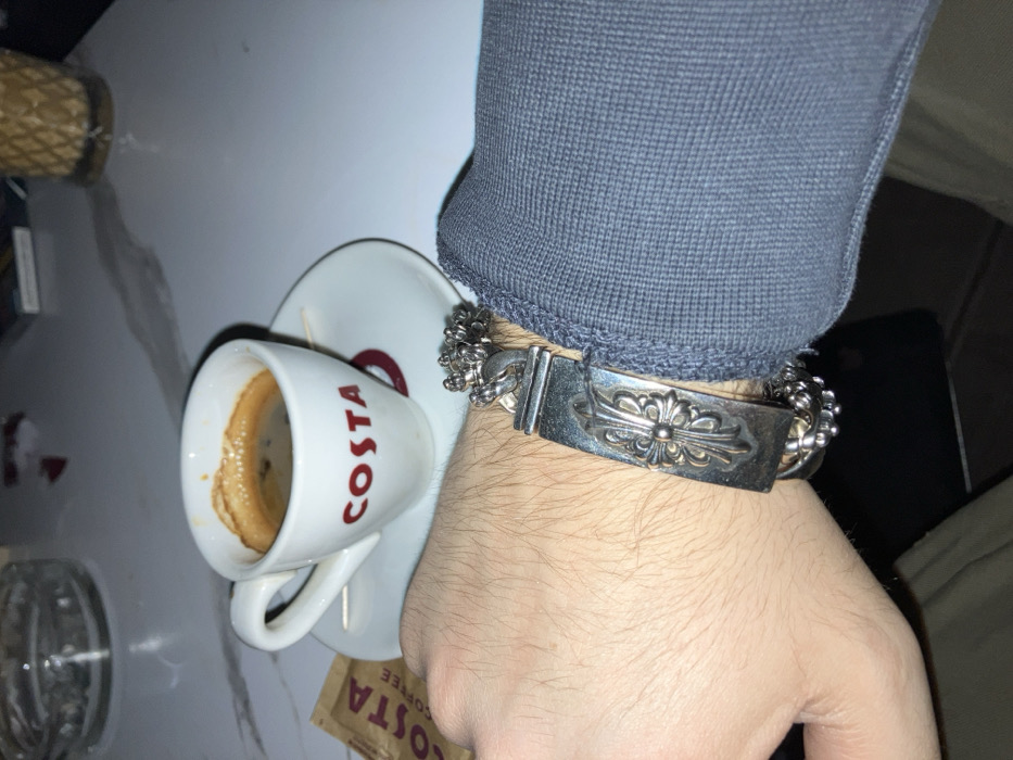 A close-up, elevated perspective photograph captures a scene on a white marble-patterned table in Stara Zagora, Bulgaria. In the lower left, a fair-skinned, hairy left forearm and hand are visible, wearing a prominent, ornate silver-colored metal bracelet. The bracelet features a central rectangular plaque embossed with a cross-like floral motif, connected to a chain of intricate, decorative links. The cuff of a grey or dark blue long-sleeved garment covers the upper portion of the wrist. To the right of the hand, a white ceramic espresso cup, branded "COSTA" in red, contains a dark brown liquid topped with a light brown crema. The cup rests on a matching white saucer, which also holds a slender wooden stirrer. A partially visible brown sugar packet, also branded "COSTA COFFEE," lies to the left of the cup. In the blurred background, an ashtray containing cigarette butts is positioned in the upper left. Towards the upper right, a textured, possibly glass or plastic, beverage container and a pack of cigarettes are discernible on the table surface. The overall lighting suggests an indoor setting.
