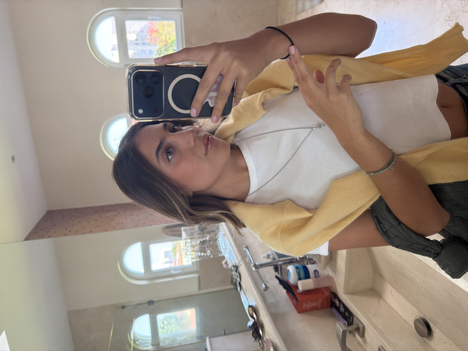 A young adult female is depicted taking a mirror selfie in a well-lit, private bathroom. She has long, wavy light brown hair with highlights, light-colored eyes, and is wearing a white crop top with a light yellow sweater draped over her shoulders. A silver chain necklace with a small cross pendant is visible. A black elastic band is on her left wrist, and a beaded bracelet on her right. She holds a dark-colored smartphone with a clear MagSafe case in her left hand, angled towards the mirror to capture her reflection. Her right hand is slightly raised. A dark green woven handbag hangs on her right arm. The bathroom features light-colored marble countertops and walls, with a chrome faucet and various toiletries, including sunglasses and bottles, scattered on the counter. Two arched windows are visible in the background, showcasing green foliage through the left window and an urban building with trees displaying autumn colors through the right. The specific location within Mexico City, Mexico, is not discernible from the visual details present in the image. The setting appears to be a modern, affluent residence or hotel bathroom.