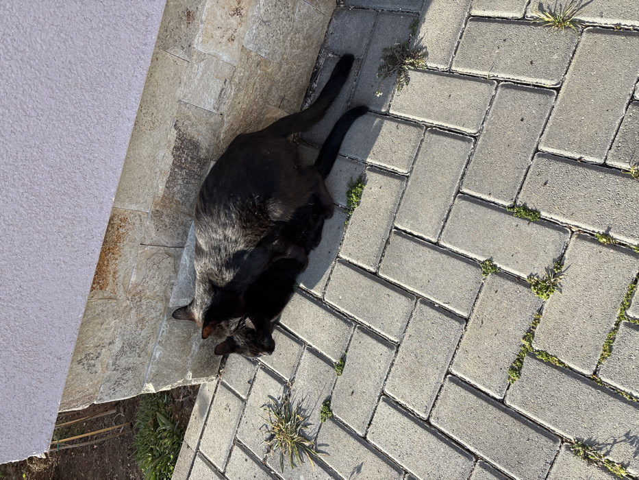 - "An overhead view depicts two black cats resting on a gray paver pathway adjacent to a building in Topolovo, Bulgaria" by FM-3mcow2, licensed under CC BY 4.0