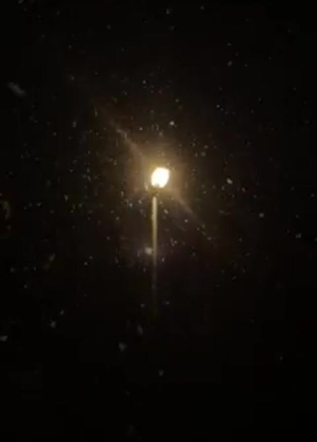 street lamp at night, illuminated against a dark background. Snowflakes are falling and are visible as they pass through the light of the lamp. The lamp appears to be a single point of bright light.