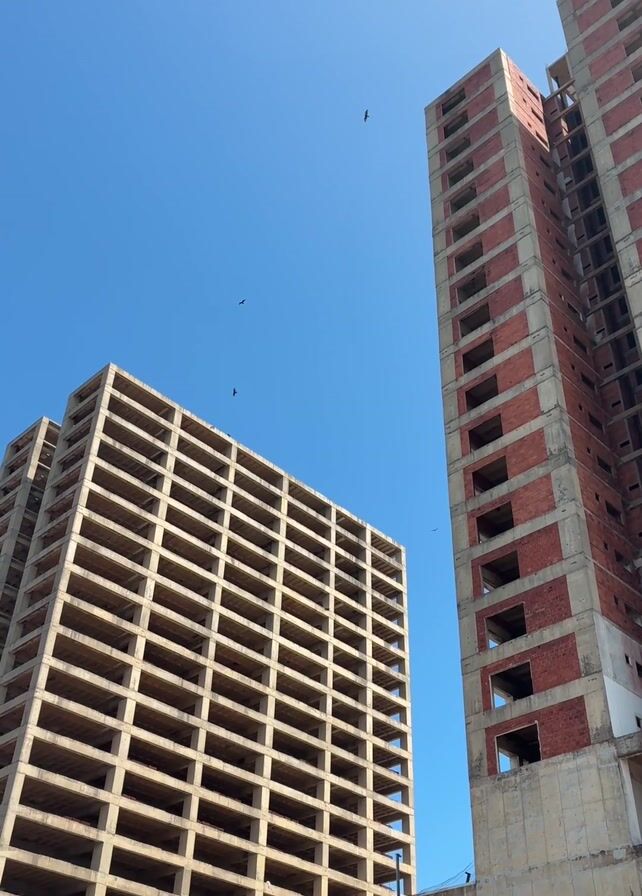 The low-angle video shows two buildings under construction against a clear, bright blue sky