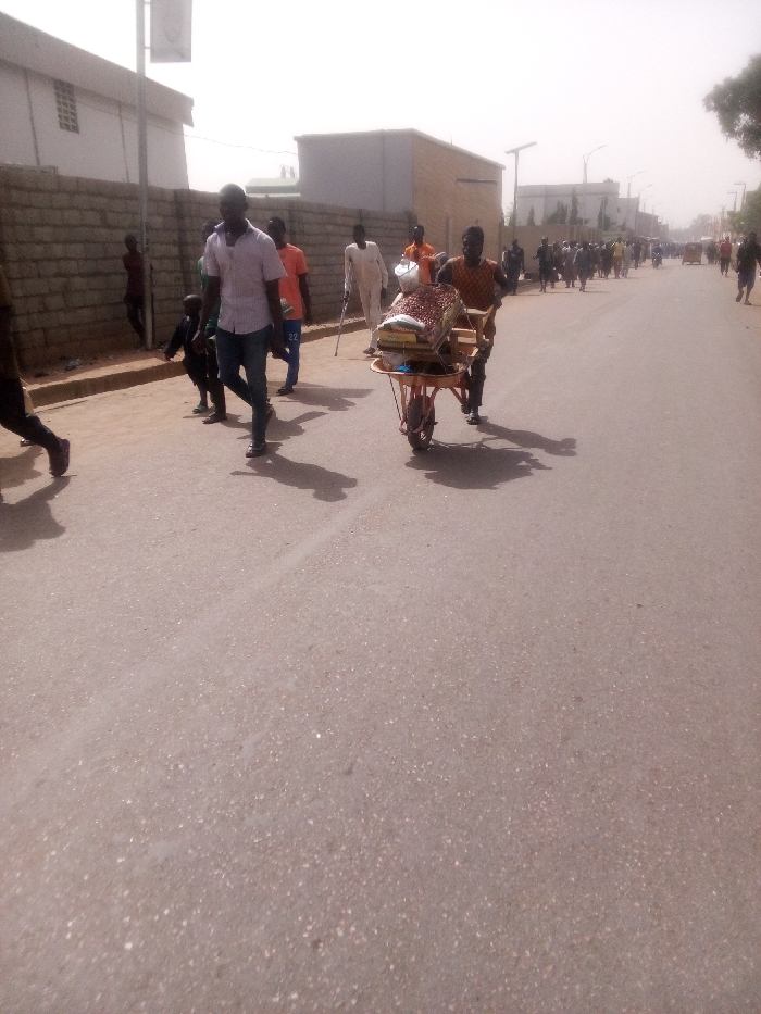 The image portrays a daytime street scene in Tudun Murtala, Nigeria