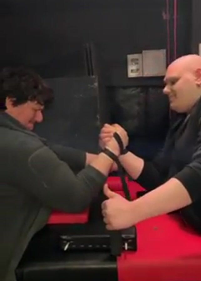Two men are arm wrestling on a table with red pads. A black strap is used to secure their hands together. The man on the left has dark curly hair and is wearing a green jacket. The man on the right is bald and wearing a black jacket. The environment looks like a basement or a garage, with dark walls and overhead lighting. The table is black with red accents. The man on the right wins the arm wrestling match.