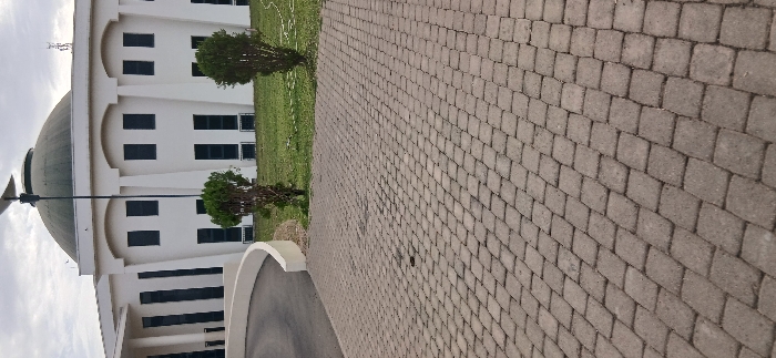 A white building with a dome, black windows, and arched facades stands next to a green lawn with two shrubbery. The foreground features a light brown bricked pathway. A light pole is also visible beside the dome. The image is taken from a low angle, with the pathway taking up most of the frame, emphasizing the building's perspective in the background. The sky is overcast.