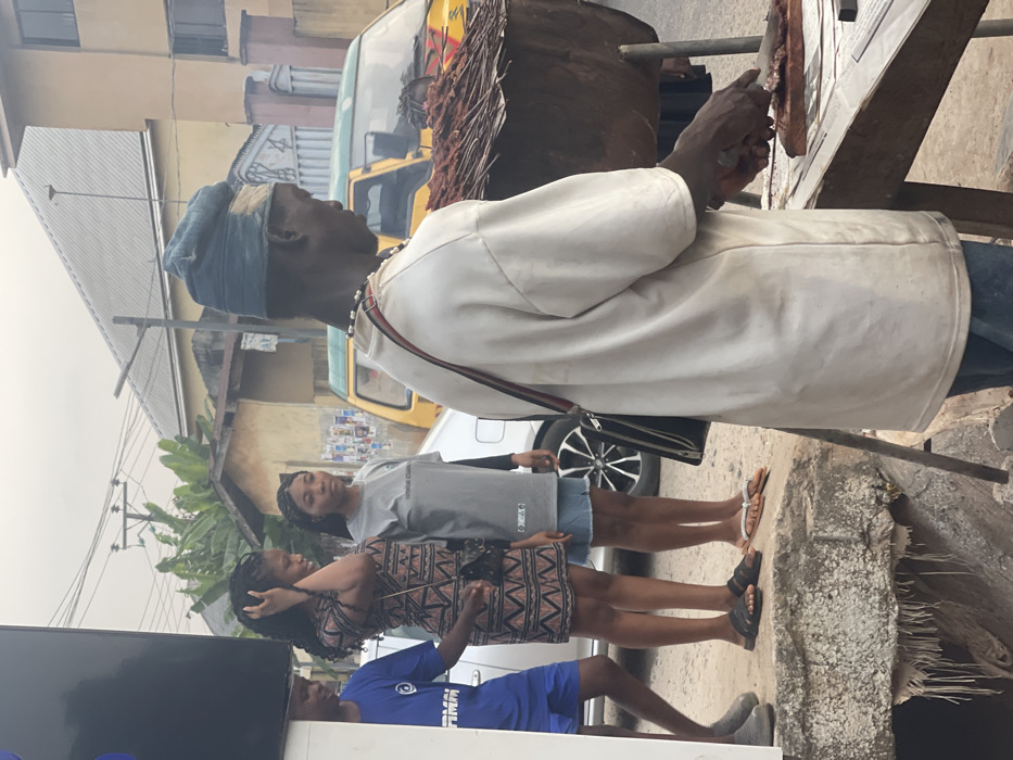 An elderly street food vendor prepares meat, while three younger individuals stand nearby. The vendor wears a white shirt, beads, and a head wrap. A small purse hangs on his side. The group is standing in a dusty outdoor area. A yellow vehicle is parked on the street. The background shows a cluttered urban street setting.