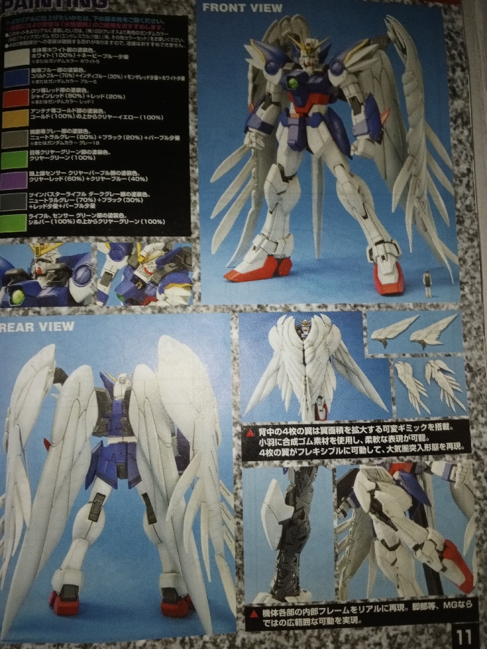 This image presents instructions and visual references for painting a model kit, likely a Gundam. A color guide on the left lists specific paint mixes for various parts (white, blue, red, gold, gray, green, purple, and silver). Full front and rear views are displayed, along with close-ups emphasizing wing details, articulation, and internal frame. Text highlights features such as the flexible wings made of synthetic rubber, and the realistic recreation of the internal frame.