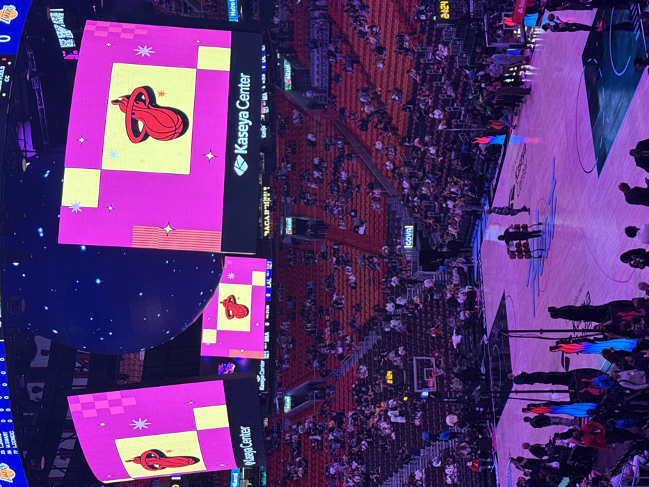 The image depicts the interior of a large sports arena, specifically the Kaseya Center in Miami, United States of America