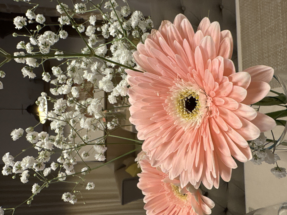 This image presents a still life composition situated indoors in Podličak, Montenegro. The primary subjects are two light pink gerbera daisies, prominently positioned in the foreground. The most central gerbera displays a dark, circular center surrounded by yellow florets and numerous soft pink petals. Behind the gerberas, a dense arrangement of white gypsophila flowers creates a soft, airy backdrop. The flowers are held within a clear glass vase, partially visible at the base of the image. The background is out of focus, revealing an illuminated dark-toned ceiling pendant light fixture emitting a warm yellow glow. Blurred elements in the environment include a light-toned tufted sofa or upholstered furniture, light-colored curtains, and a light, textured surface supporting the vase. No people or specific actions are depicted.