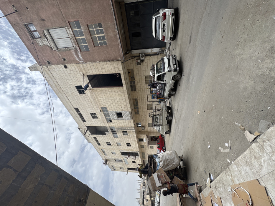 The scene is a street in Sbeneh, Syria (latitude: 33.444, longitude: 36.277). The street is lined with buildings, one of which is a large, multi-story structure with many windows. The building is made of beige brick and appears to be damaged. There are four vehicles parked on the street: a white pickup truck, a white van, a red car, and a white SUV. There are also several people in the scene: two men standing on a pile of cardboard boxes, a man sitting in a parked car, and a young girl walking on the sidewalk. There are also numerous pieces of cardboard scattered on the ground. The sky is partly cloudy. The scene is located in an urban area.