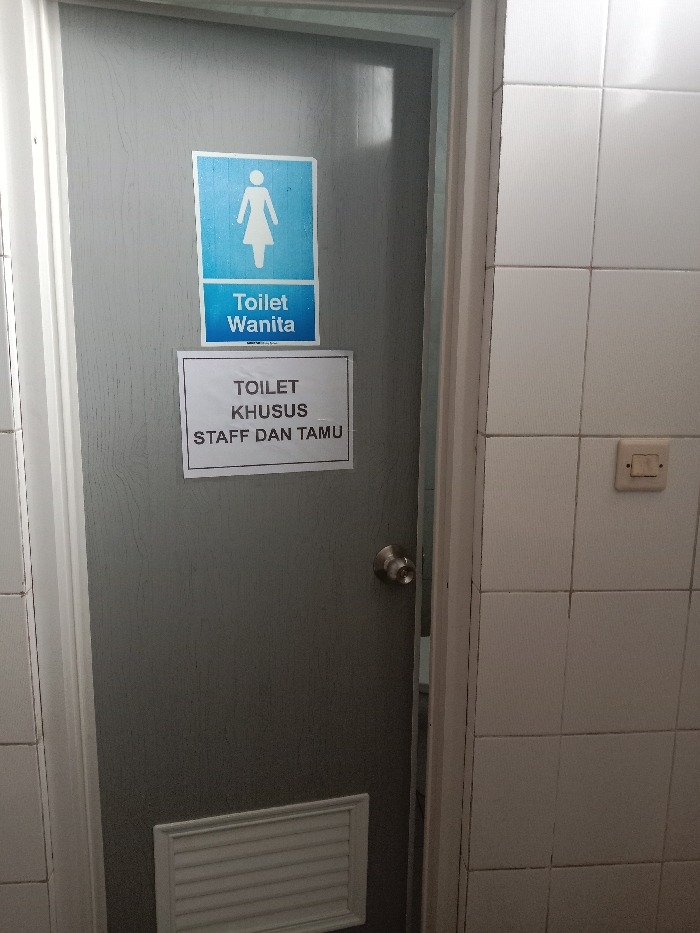 A restroom door, labeled "Toilet Wanita" and "Toilet Khusus Staff Dan Tamu," indicating a women's restroom for staff and guests