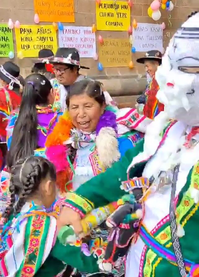 group of people in vibrant traditional clothing dancing in what appears to be a public space, possibly a plaza. Several people are wearing embroidered outfits, and a child with braids is also dressed in traditional attire. One person is wearing a white mask with white foam on it. Behind them, a brick wall is decorated with colorful balloons and signs with text in an unfamiliar language. The people are smiling and appear to be celebrating. The atmosphere seems festive.