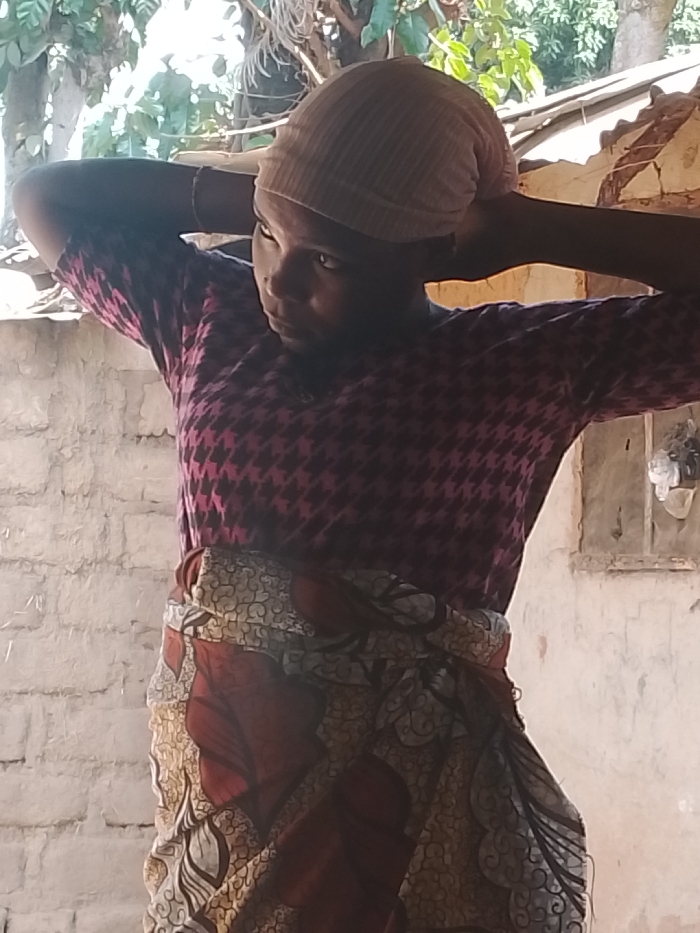 A single adult female is depicted in a medium shot, facing left with her head turned slightly towards the viewer. She wears a light-colored ribbed beanie and a short-sleeved, dark purple and light pink houndstooth patterned top. A patterned wrap skirt, featuring red, beige, and dark grey designs, is tied at her waist. Her arms are raised with hands positioned behind her head, elbows bent. A silver-colored bracelet is present on her left wrist. The background consists of a light-colored brick wall on the left and a darker, textured wall with a small rectangular opening on the right. Green foliage is visible above the background structures. The scene is illuminated by daylight. The location is the city of Unknown, Unknown.