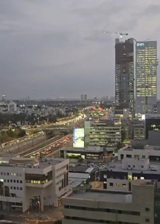 n elevated view of a city, likely taken from a high-rise building. There are multiple tall buildings and skyscrapers visible, with some under construction, indicated by cranes. A busy highway runs through the middle of the frame, filled with cars. A train is visible on tracks in the lower left of the view. The sky is overcast, suggesting it is either early morning or late evening. The buildings are lit up, indicating that it is dark. Overall, the scene portrays an urban environment with ongoing construction and heavy traffic.
