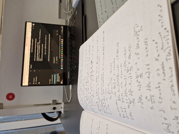 The image captures a workspace featuring a laptop and an open notebook filled with handwritten mathematical equations and notes. The notebook contains complex mathematical notations and terminology, suggesting a focus on advanced mathematical concepts. On the laptop screen, there's text indicating software or programming-related content. The scene evokes an atmosphere of intellectual engagement and concentrated study.
