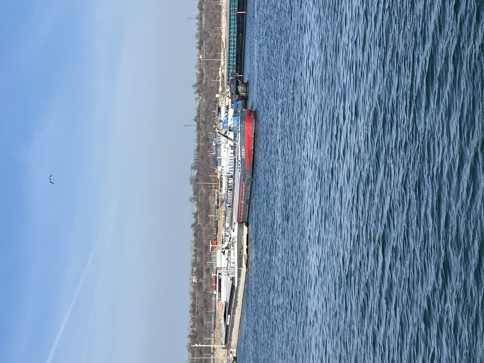 The image displays an industrial port scene in Constanța, Romania. The lower half of the frame is dominated by rippled, dark blue water. In the midground, multiple vessels are visible. A red and black tugboat or push boat, clearly labeled "LIBERO" in white capital letters on its hull, is centrally positioned. To its left, a large, dark-hulled barge with "MINA" partially visible on its side is moored. To the right of the "LIBERO," another dark-hulled barge, laden with a light-colored granular material, is present. Additional vessels, including white-hulled boats and other barges, are discernible further back. The background features a low, treeless landmass with scattered industrial elements, including utility poles, power lines, and several freight train cars, red and gray, on railway tracks. The upper portion of the frame shows a clear, light blue sky with a distinct diagonal contrail in the upper left quadrant and a solitary bird in flight in the upper right. No human figures are identifiable.