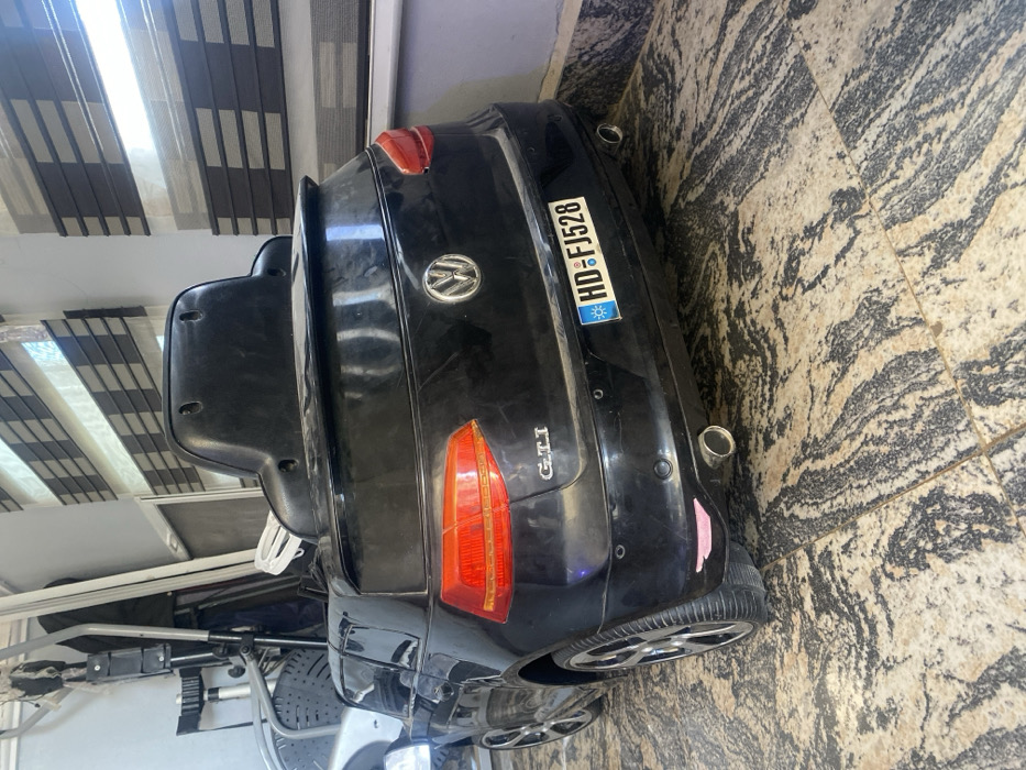 - "The image displays the rear view of a black, child-sized ride-on toy car, designed to resemble a Volkswagen Golf GTI, parked indoors" by FM-T4PRJ3, licensed under CC BY 4.0