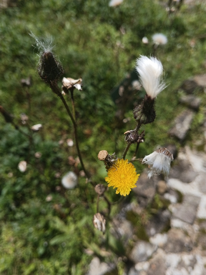 A close-up depicts a slender plant with a vibrant yellow flower at its center. Several seed heads, adorned with delicate white tufts, emerge above and adjacent to the bloom. The surrounding greenery is blurred, indicating a shallow depth of field. Additionally, gray stones are visible in the periphery, suggesting an outdoor setting. The image captures the plant's life cycle from flower to seed dispersal.