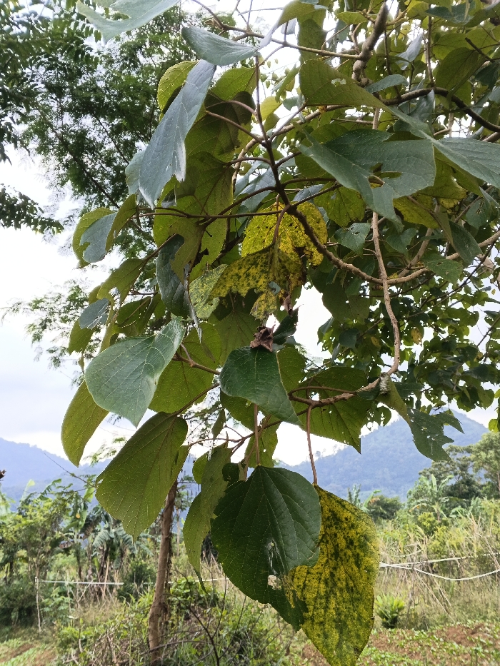 The image depicts a close-up view of dense tree foliage set against a natural, mountainous background. In the foreground, numerous broad, ovate leaves are visible, primarily in various shades of green. Several leaves exhibit significant yellowing, often accompanied by dark green mottling or spots, suggesting senescence or disease. Physical damage, including holes, tears, and irregular edges, is present on multiple leaves. These leaves are attached to slender, bare, brown branches that crisscross the frame. The midground features additional dense green vegetation, with some areas of visible brown earth and a faint, thin, white horizontal line, possibly a wire or string. The background is dominated by large, distant mountains, appearing bluish-green and hazy under an overcast or bright sky. The mountains are heavily vegetated. No individuals or man-made structures, beyond the possible wire, are present. Based on the prominent mountainous terrain and dense natural vegetation, the scene is consistent with a rural or semi-rural mountainous area rather than an urban setting. While the prompt requests a location within the city of Chengdu, China, the visual evidence strongly suggests an environment found in the mountainous regions surrounding Chengdu within Sichuan province, rather than the urban core of Chengdu itself.