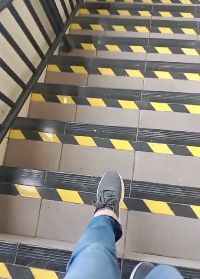 first-person perspective of a person walking down a flight of stairs. The person is wearing blue jeans and gray sneakers. The stairs have alternating rows of gray and black tiles with yellow warning stripes on the edge of each step. A black metal railing is to the left of the stairs.