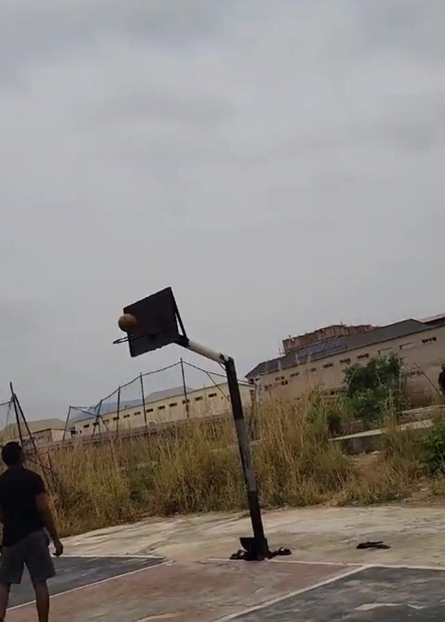 The video depicts two men playing basketball on an outdoor court under a cloudy sky