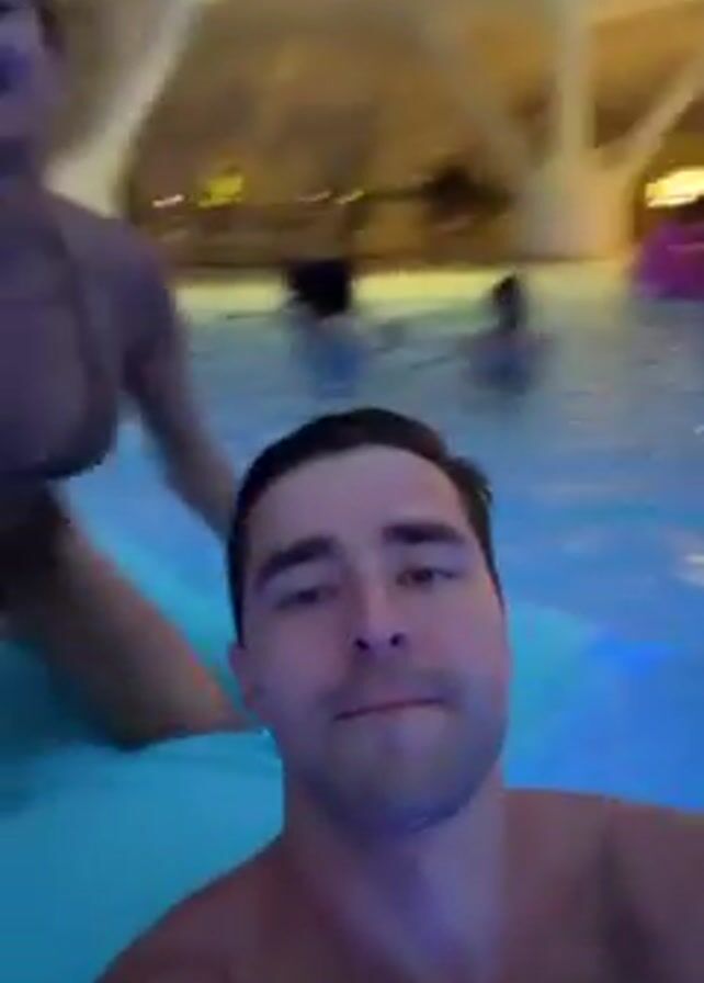 A man holds a camera, recording himself in a brightly lit pool. A woman appears behind him, grinning and exclaiming, then briefly placing her hand on his shoulder. The pool is indoors, and several other people can be seen in the background. The water is illuminated with blue light, and the room has bright yellow and white lighting fixtures. The man looks at the camera throughout the video, making an exaggerated surprised face at one point.