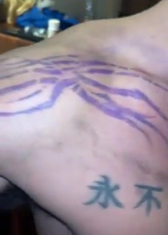 shirtless man with a purple tattoo design sketched on his left shoulder and chest. He also has a tattoo of four Chinese characters on his chest. He is wearing a necklace with a pendant. In the background, there's a dresser with various objects, including a water bottle and clothing. The man moves slightly, showing more of the tattoo design and his chest.