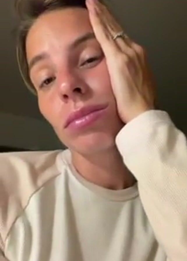 close-up of a woman with short blonde hair, wearing a light-colored, long-sleeved shirt. She is looking directly at the camera with a weary expression. Her left hand is supporting her forehead. The background is blurry and indistinct. The lighting is soft and appears to be indoor lighting. The woman has full lips with a glossy appearance, and is wearing a ring on her left ring finger.