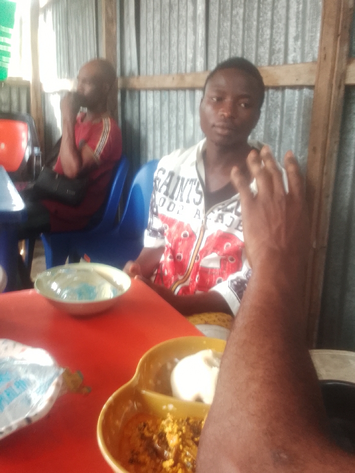 A man is seated at an orange table. A white bowl and a dish divided into two sections, containing white fufu and a yellow sauce, are on the table. Behind the man is another man with a black bag sitting on a blue chair. The first man has a Saints jacket. The background consists of corrugated metal. A dark-skinned hand is raised in the foreground.
